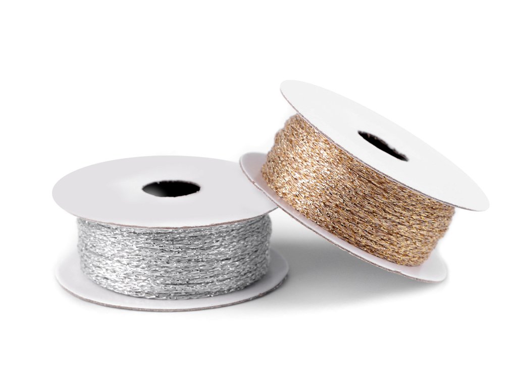 Splétaná šňůrka se díky lurexovému vláknu elegantně třpytí. Nevšedně s ní zabalíte a ozdobíte dárky, využijete k různým dekoračním účelům, nebo ji můžete použít jako navlékací materiál při výrobě náhrdelníků, náramků, apod.