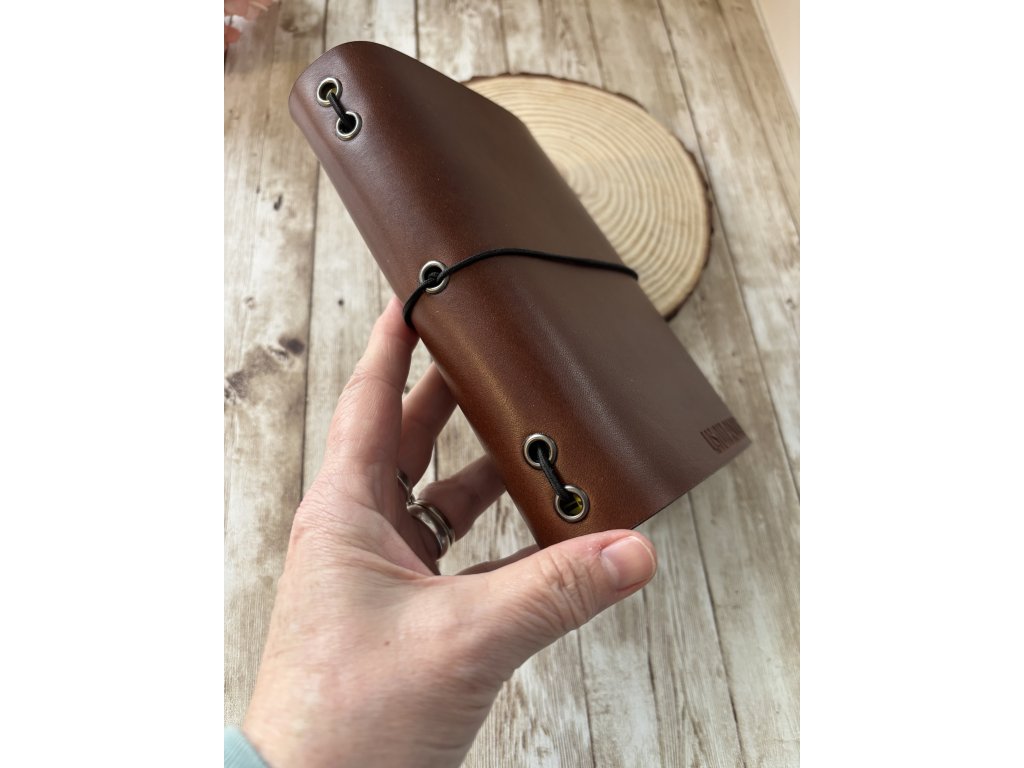 Tento ručně vyráběný kožený obal na knihy a diáře formátu A5 nebo A6 je vyroben z přírodní hovězí kůže o tloušťce 2,5–3,5 mm, která byla pečlivě mořená a ošetřena voskem, aby byla odolná vůči poškození a zároveň si zachovala přirozenou krásu kůže.